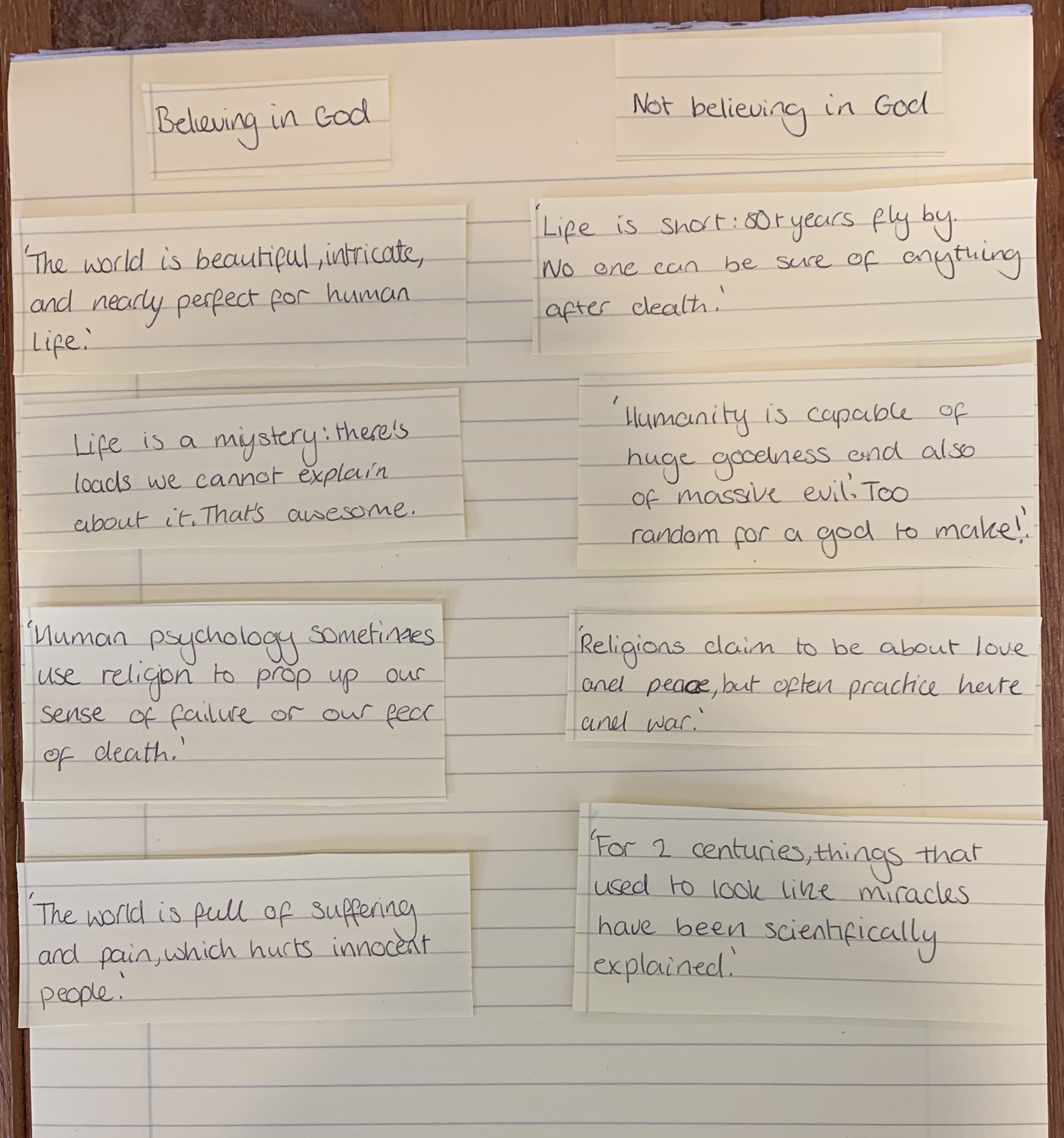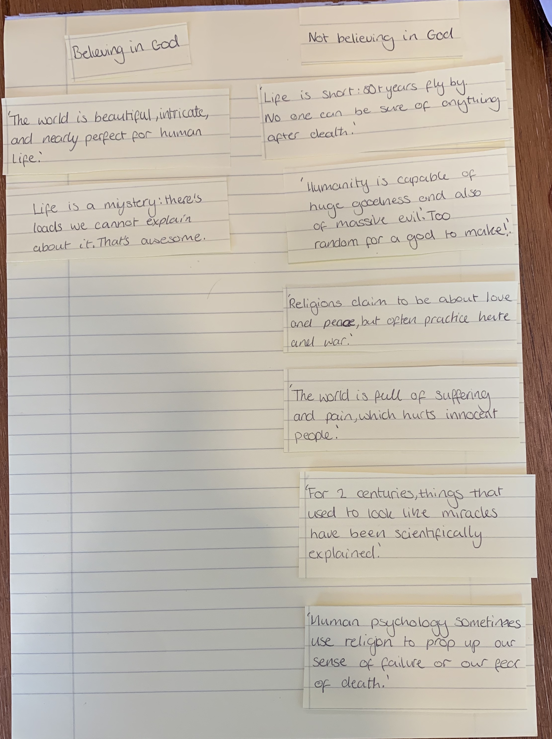 In S1 RMPS, Mr Patrick’s class have been looking at “The Existence of God” as a topic. Pupils were asked to sort claims about this topic under 2 headings “Belief that there is a God” and “Belief that there is no God”, comparing the strength of each argument. As you can see, this was completed very well, with one particular pupil even evaluating her work, sending in a new draft with her own thoughts on the topic. Big well done!”