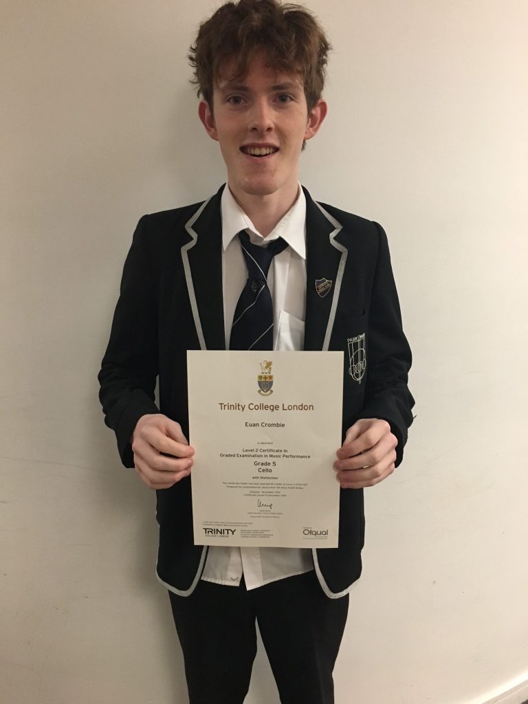 Euan Crombie (S6) gained a distinction in his ABRSM Grade 5 ‘Cello. In order to achieve this he performed three pieces of music, a range of scales, aural tests and sightreading. Euan is planning on going to university to study music.